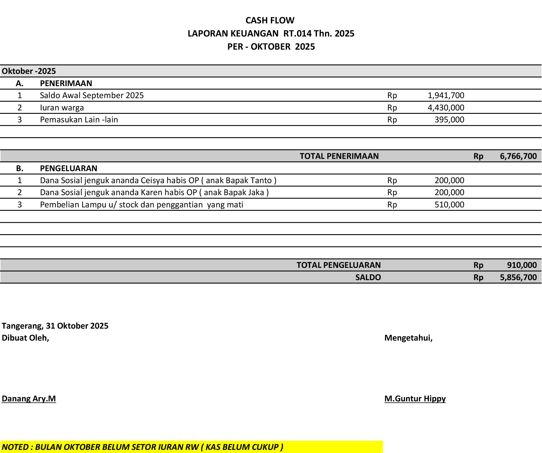 Laporan Keuangan Bulan Oktober 2025